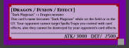 | Card info: | Doom Virus Dragon DARK / Dragon-Type Fusion / Level 4 / ATK 1900 / DEF 1500 Must be Special Summoned with "The Fang of Critias", using "Crush Card Virus". If this card is Special Summoned: Look at your opponent's hand, all monsters they control, and all cards they draw until the end of their 3rd turn after this effect's activation, and destroy all those monsters with 1500 or more ATK. COMMON |