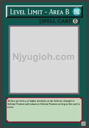 Level Limit - Area B Continuous Spell All face-up Level 4 or higher monsters on the field are changed to Defense Position and remain in Defense Position as long as this card is active. SUPER RARE |