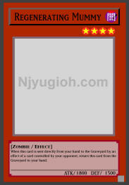 Regenerating Mummy DARK / Zombie / Level 4 / ATK 1800 / DEF 1500 When this card is sent directly from your hand to the Graveyard by an effect of a card controlled by your opponent, return this card from the Graveyard to your hand. SUPER RARE |