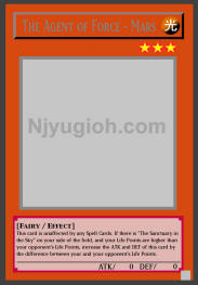 The Agent of Force - Mars LIGHT / Fairy / Level 3 / ATK 0 / DEF 0 This card is unaffected by any Spell Cards. If there is "The Sanctuary in the Sky" on your side of the field, and your Life Points are higher than your opponent's Life Points, increase the ATK and DEF of this card by the difference between your and your opponent's Life Points. RARE |
