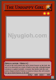 The Unhappy Girl LIGHT / Spellcaster / Level 2 / ATK 400 / DEF 300 As long as this card remains face-up in Attack Position on the field, this card is not destroyed as a result of battle at any time, although damage calculation is applied normally. A monster that battles with this card cannot change its Battle Position or attack as long as this card remains face-up in Attack Position on the field. SUPER RARE |