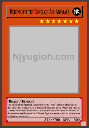 Behemoth the King of All Animals EARTH / Beast / Level 7 / ATK 2700 / DEF 1500 This card can be Normal Summoned or Set with 1 Tribute Monster. In that case, the original ATK of this card becomes 2000. When this card is Tribute Summoned successfully, you can return from your Graveyard to the owner's hand a number of Beast-Type monsters equal to the number of Tributed monsters. COMMON |