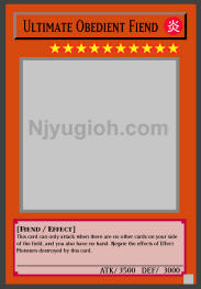 Ultimate Obedient Fiend FIRE / Fiend / Level 10 / ATK 3500 / DEF 3000 This card can only attack when there are no other cards on your side of the field, and you also have no hand. Negate the effects of Effect Monsters destroyed by this card. COMMON |