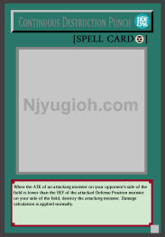 Continuous Destruction Punch Continuous Spell When the ATK of an attacking monster on your opponent's side of the field is lower than the DEF of the attacked Defense Position monster on your side of the field, destroy the attacking monster. Damage calculation is applied normally. RARE |