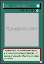 Big Bang Shot Equip Spell A monster equipped with this card increases its ATK by 400 points. When the equipped monster attacks with an ATK that is higher than the DEF of your opponent's Defense Position monster, inflict the difference as battle damage to your opponent's Life Points. When this card is destroyed or removed from the field, the equipped monster is removed from play. RARE |