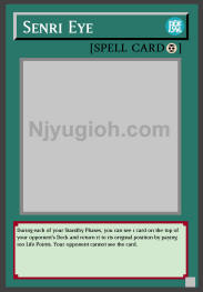 Senri Eye Continuous Spell During each of your Standby Phases, you can see 1 card on the top of your opponent's Deck and return it to its original position by paying 100 Life Points. Your opponent cannot see the card. COMMON |