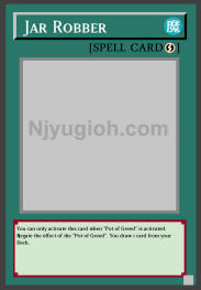 Jar Robber Quick-Play Spell You can only activate this card when "Pot of Greed" is activated. Negate the effect of the "Pot of Greed". You draw 1 card from your Deck. COMMON |