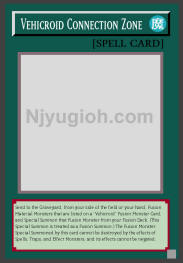 Vehicroid Connection Zone Normal Spell Send to the Graveyard, from your side of the field or your hand, Fusion Material Monsters that are listed on a "Vehicroid" Fusion Monster Card, and Special Summon that Fusion Monster from your Fusion Deck. (This Special Summon is treated as a Fusion Summon.) The Fusion Monster Special Summoned by this card cannot be destroyed by the effects of Spells, Traps, and Effect Monsters, and its effects cannot be negated. SUPER RARE |
