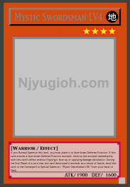 Mystic Swordsman LV4 EARTH / Warrior / Level 4 / ATK 1900 / DEF 1600 If you Normal Summon this card, you must place it in face-down Defense Position. If this card attacks a face-down Defense Position monster, destroy the monster immediately with this card's effect without flipping it face-up or applying damage calculation. During the End Phase of a turn that this card destroyed a monster as a result of battle, send this card to the Graveyard to Special Summon 1 "Mystic Swordsman LV6" from your hand or Deck. RARE |