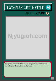 Two-Man Cell Battle Continuous Spell During each player's End Phase, each player can Special Summon 1 Level 4 Normal Monster from his/her hand. SUPER RARE |