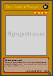 Gene-Warped Warwolf EARTH / Beast-Warrior / Level 4 / ATK 2000 / DEF 100 This warwolf was given incalculable strength through horrific genetic manipulation. Its gentle nature was completely wiped out, and it now lives only to unleash destruction. ULTRA RARE |