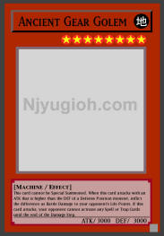Ancient Gear Golem EARTH / Machine / Level 8 / ATK 3000 / DEF 3000 This card cannot be Special Summoned. When this card attacks with an ATK that is higher than the DEF of a Defense Position monster, inflict the difference as Battle Damage to your opponent's Life Points. If this card attacks, your opponent cannot activate any Spell or Trap Cards until the end of the Damage Step. SUPER RARE |