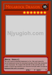 Megarock Dragon EARTH / Rock / Level 7 / ATK ? / DEF ? This card cannot be Normal Summoned or Set. This card cannot be Special Summoned except by removing from play a Rock-Type monster(s) in your Graveyard. The original ATK and DEF of this card become the number of Rock-Type monsters you removed from play when you Special Summoned this card x 700 points. ULTRA RARE |