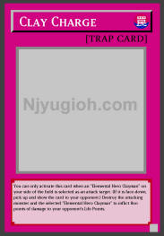 Clay Charge Normal Trap You can only activate this card when an "Elemental Hero Clayman" on your side of the field is selected as an attack target. (If it is face-down, pick up and show the card to your opponent.) Destroy the attacking monster and the selected "Elemental Hero Clayman" to inflict 800 points of damage to your opponent's Life Points. COMMON |