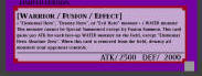| Comments: | Bringing this guy out with 2 monsters may seem pretty bad for a Level 5 monster but if it destroys a monster, it gets 800 ATK and can attack again yet the ATK gain isn't permanent. |