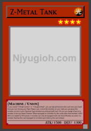 Z-Metal Tank LIGHT / Machine-Type Union / Level 4 / ATK 1500 / DEF 1300 If you control "X-Head Cannon" or "Y-Dragon Head", you can Special Summon this card from your hand. Once per turn during your Main Phase if you control this monster on your field you can equip this monster on one of your Machine-Type monsters as an Equip Spell Card. OR you can change it back to a monster in face up Attack Position. When equipped to a monster by this cards effect that monster's ATK/DEF is increased by 900 points. A monster can only be equipped with one Union Monster at a time. If a monster that has this card equipped to it is destroyed, destroy this card instead. SUPER RARE |