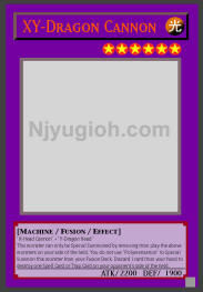 XY-Dragon Cannon LIGHT / Machine-Type Fusion / Level 6 / ATK 2200 / DEF 1900 "X-Head Cannon" + "Y-Dragon Head" This monster can only be Special Summoned by removing from play the above monsters on your side of the field. You do not use "Polymerization" to Special Summon this monster from your Fusion Deck. Discard 1 card from your hand to destroy one Spell Card or Trap Card on your opponent's side of the field. ULTRA RARE |