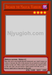 Breaker the Magical Warrior DARK / Spellcaster / Level 4 / ATK 1600 / DEF 1000 When this card is successfully Normal Summoned, put 1 Spell Counter on it (max 3). Increase the ATK of this monster by 300 points for each Spell Counter on this card. When a Spell Card is activated, put 1 Spell Counter on this card. Also, you can remove 1 Spell Counter from this card to destroy 1 Spell Card or Trap Card on the field. ULTRA RARE |