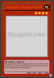 Amazoness Swords Woman EARTH / Warrior / Level 4 / ATK 1500 / DEF 1600 The opponent takes all Battle Damage to this card's controller that he/she takes from a battle involving this monster. Once per turn, this card cannot be destroyed as a result of battle. ULTRA RARE |