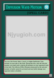 Diffusion Wave-Motion Normal Spell Pay 1000 Life Points. Select 1 Level 5 or higher Spellcaster-Type monster on your side of the field. During this turn, only the selected monster can attack and it attacks all monsters on your opponent's side of the field. The effects of Effect Monsters destroyed by the selected monster in battle cannot be activated and any battle damage your opponent takes is doubled. SECRET RARE |