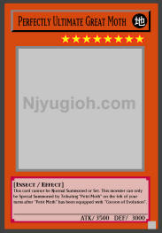 Perfectly Ultimate Great Moth EARTH / Insect / Level 8 / ATK 3500 / DEF 3000 This card cannot be Normal Summoned or Set. This monster can only be Special Summoned by Tributing "Petit Moth" on the 6th of your turns after "Petit Moth" has been equipped with "Cocoon of Evolution". COMMON |