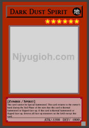 Dark Dust Spirit EARTH / Zombie-Type Spirit / Level 6 / ATK 2200 / DEF 1800 This card cannot be Special Summoned. This card returns to the owner's hand during the End Phase of the turn that this card is Normal Summoned or flipped face-up. If this card is Normal Summoned or flipped face-up, destroy all face-up monsters on the field except this card. SUPER RARE |