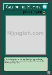 Call of the Mummy Continuous Spell If there is no monster on your side of the field, you can Special Summon 1 Zombie-Type monster from your hand. You can use this effect only once per turn. SUPER RARE |