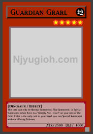 Guardian Grarl EARTH / Dinosaur / Level 5 / ATK 2500 / DEF 1000 This card can only be Normal Summoned, Flip Summoned, or Special Summoned when there is a "Gravity Axe - Grarl" on your side of the field. If this is the only card in your hand, you can Special Summon it without offering Tributes. SUPER RARE |