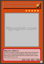 Different Dimension Dragon LIGHT / Dragon / Level 5 / ATK 1200 / DEF 1500 The effect of a Spell of Trap Card cannot destroy this card unless the Spell or Trap Card specifically designates a target. This card is not destroyed as a result of battle when this card battles with a monster with an ATK of 1900 or less. RARE |