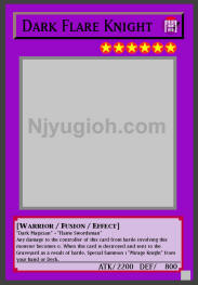 Dark Flare Knight DARK / Warrior-Type Fusion / Level 6 / ATK 2200 / DEF 800 "Dark Magician" + "Flame Swordsman" Any damage to the controller of this card from battle involving this monster becomes 0. When this card is destroyed and sent to the Graveyard as a result of battle, Special Summon 1 "Mirage Knight" from your hand or Deck. COMMON |