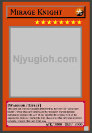 Mirage Knight LIGHT / Warrior / Level 8 / ATK 2800 / DEF 2000 This card can only be Special Summoned by the effect of "Dark Flare Knight". When this card battles another monster, during damage calculation increase the ATK of this card by the original ATK of the opponent's monster. During the End Phase after this card was involved in battle, remove this card from play. COMMON |