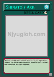 Shinato's Ark Ritual Spell This card is used to Ritual Summon "Shinato, King of a Higher Plane". You must also offer monsters whose total Level Stars equal 8 or more as a Tribute from the field or your hand. SECRET RARE |