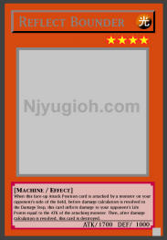Reflect Bounder LIGHT / Machine / Level 4 / ATK 1700 / DEF 1000 When this face-up Attack Position card is attacked by a monster on your opponent's side of the field, before damage calculation is resolved in the Damage Step, this card inflicts damage to your opponent's Life Points equal to the ATK of the attacking monster. Then, after damage calculation is resolved, this card is destroyed. RARE |