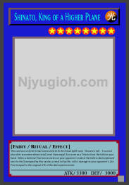 Shinato, King of a Higher Plane LIGHT / Fairy-Type Ritual / Level 8 / ATK 3300 / DEF 3000 This card can only be Ritual Summoned with the Ritual Spell Card, "Shinato's Ark". You must also offer monsters whose total Level Stars equal 8 or more as a Tribute from the field or your hand. When a Defense Position monster on your opponent's side of the field is destroyed and sent to the Graveyard by this card as a result of battle, inflict damage to your opponent's Life Points equal to the original ATK of the destroyed monster. SECRET RARE |