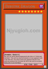 Berserk Dragon DARK / Zombie / Level 8 / ATK 3500 / DEF 0 This card can only be Special Summoned by the effect of "A Deal with Dark Ruler". This card can attack all monsters on your opponent's side of the field once. You cannot attack your opponent directly if you attack any monsters first. Decrease the ATK of this card by 500 points during each of your End Phases. RARE |