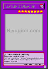 Gatling Dragon DARK / Machine-Type Fusion / Level 8 / ATK 2600 / DEF 1200 "Barrel Dragon" + "Blowback Dragon" Toss a coin 3 times. Destroy a number of monsters on the field equal to the number of Heads. This effect can only be used once per turn, during your Main Phase. RARE |