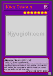 King Dragun DARK / Dragon-Type Fusion / Level 7 / ATK 2400 / DEF 1100 "Lord of D." + "Divine Dragon Ragnarok" As long as this card remains face-up on the field, your opponent cannot target Dragon-Type monsters for the effect of a Spell, Trap, or Monster Card. Once per turn, you can Special Summon 1 Dragon-Type monster from your hand to your side of the field. ULTRA RARE |
