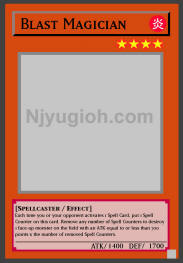 Blast Magician FIRE / Spellcaster / Level 4 / ATK 1400 / DEF 1700 Each time you or your opponent activates 1 Spell Card, put 1 Spell Counter on this card. Remove any number of Spell Counters to destroy 1 face-up monster on the field with an ATK equal to or less than 700 points x the number of removed Spell Counters. COMMON |