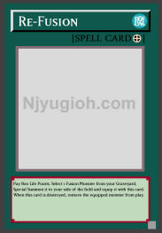 Re-Fusion Equip Spell Pay 800 Life Points. Select 1 Fusion Monster from your Graveyard, Special Summon it to your side of the field and equip it with this card. When this card is destroyed, remove the equipped monster from play. SUPER RARE |