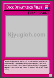 Deck Devastation Virus Normal Trap Tribute 1 DARK monster with an ATK of 2000 points or more on your side of the field. Check all monsters on your opponent's side of the field, your opponent's hand, and all cards he/she draws during your opponent's next 3 turns, and destroy all monsters with an ATK of 1500 or less. COMMON |