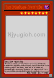 Chaos Emperor Dragon - Envoy of the End DARK / Dragon / Level 8 / ATK 3000 / DEF 2500 This card can only be Special Summoned by removing 1 LIGHT and 1 DARK monster in your Graveyard from play. Pay 1000 of your Life Points to send all cards in both players' hands and on the field to the Graveyard. Inflict 300 points of damage to your opponent's Life Points for each card that is sent to the Graveyard by this effect. ULTRA RARE |