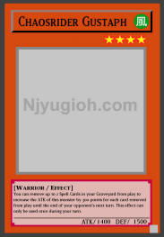 Chaosrider Gustaph WIND / Warrior / Level 4 / ATK 1400 / DEF 1500 You can remove up to 2 Spell Cards in your Graveyard from play to increase the ATK of this monster by 300 points for each card removed from play until the end of your opponent's next turn. This effect can only be used once during your turn. COMMON |