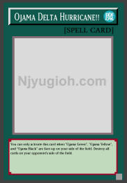 Ojama Delta Hurricane!! Normal Spell You can only activate this card when "Ojama Green", "Ojama Yellow", and "Ojama Black" are face-up on your side of the field. Destroy all cards on your opponent's side of the field. COMMON |