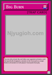 Big Burn Normal Trap You can only activate this card when your opponent activates a card that specifically designates a monster in the Graveyard as a target. Remove all monsters in both players' Graveyards from play. COMMON |
