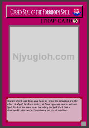 Cursed Seal of the Forbidden Spell Counter Trap Discard 1 Spell Card from your hand to negate the activation and the effect of a Spell Card and destroy it. Your opponent cannot activate Spell Cards of the same name (including the Spell Card that is destroyed by this card's effect) during the rest of this Duel. SUPER RARE |