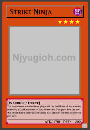 Strike Ninja DARK / Warrior / Level 4 / ATK 1700 / DEF 1200 You can remove this card from play until the End Phase of this turn by removing 2 DARK monsters in your Graveyard from play. You can use this effect during either player's turn. You can only use this effect once per turn. COMMON |