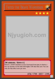 Freed the Brave Wanderer LIGHT / Warrior / Level 4 / ATK 1700 / DEF 1200 Remove 2 LIGHT monsters in your Graveyard from play to destroy 1 face-up monster on the field with higher ATK than this card. You can only use this effect once per turn. RARE |