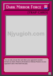 Dark Mirror Force Normal Trap You can only activate this card when your opponent's monster declares an attack. Remove all monsters in Defense Position on your opponent's side of the field from play. SUPER RARE |