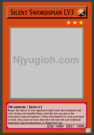 Silent Swordsman LV3 LIGHT / Warrior / Level 3 / ATK 1000 / DEF 1000 Negate the effects of your opponent's Spell Cards that designates this card. During your Standby Phase, send this face-up card to the Graveyard to Special Summon 1 "Silent Swordsman LV5" from your hand or Deck. (You cannot activate this effect the turn this card is Normal Summoned, Special Summoned, or flipped face-up). COMMON |