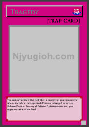 Tragedy Normal Trap You can only activate this card when a monster on your opponent's side of the field in face-up Attack Position is changed to face-up Defense Position. Destroy all Defense Position monsters on your opponent's side of the field. RARE |